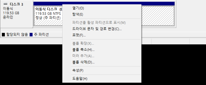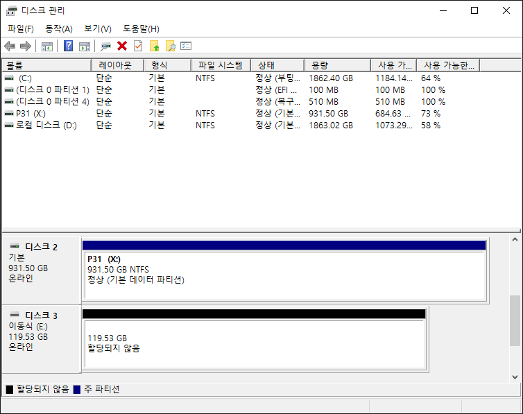 아래와 같이 디스크 관리(diskmgmt.msc)에서 실수로 사용 중이던 디스크의 파티션을 날려버린 경우