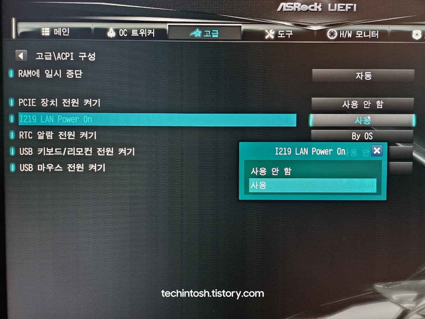 메인보드에서 Wake On Lan(WOL) 기능을 사용으로 변경