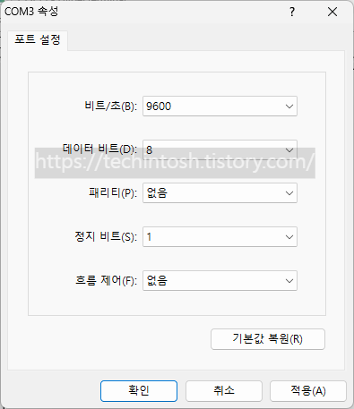 비트/초 : 9600 │ 데이터 비트 : 8 │ 패리티 : 없음 │ 장치 비트 : 1 │ 흐름 제어 : 없음 설정