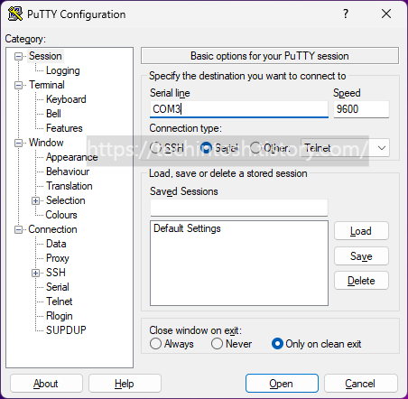 Connection type : Serial 선택 후 COM3 입력