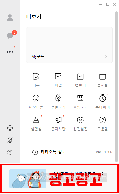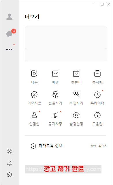 또는 카카오톡 프로그램 하단에 광고 배너를 없애고 싶다면 아래 프로그램을 통해 광고를 제거할 수 있다.